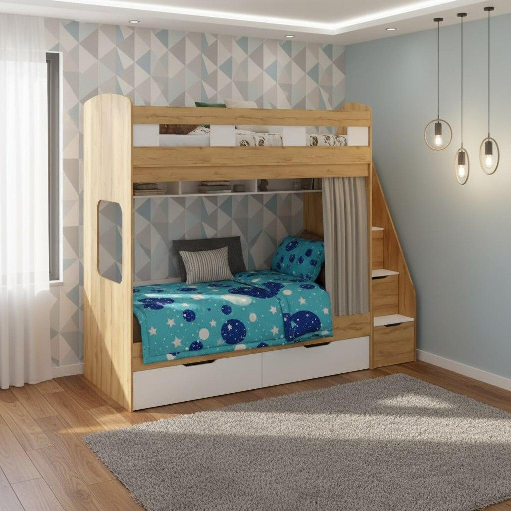 Прочная, стильная двухъярусная кровать Твинс с удобной лестницей, безопасным высоким бортиком и ящиками для хранения.