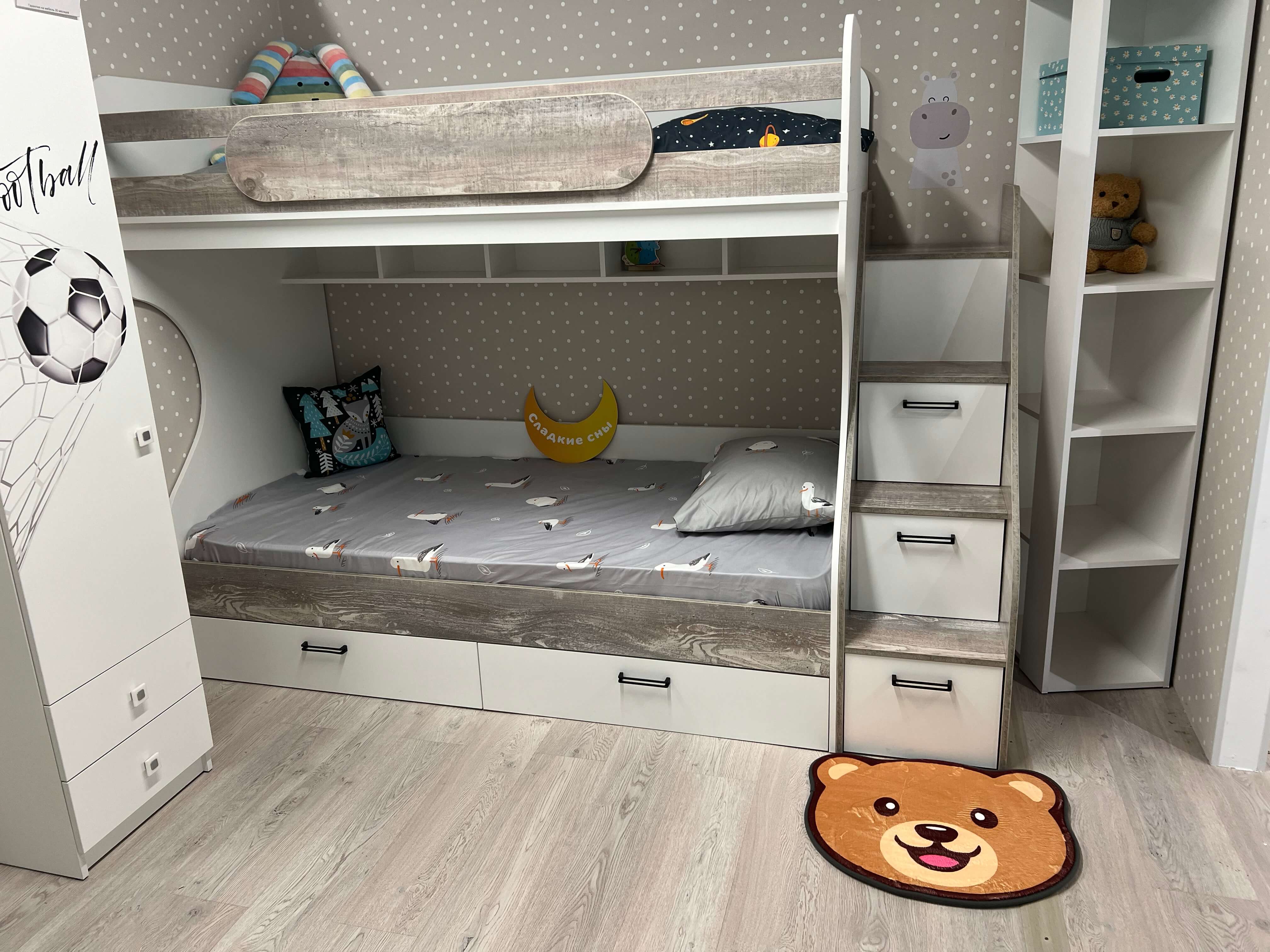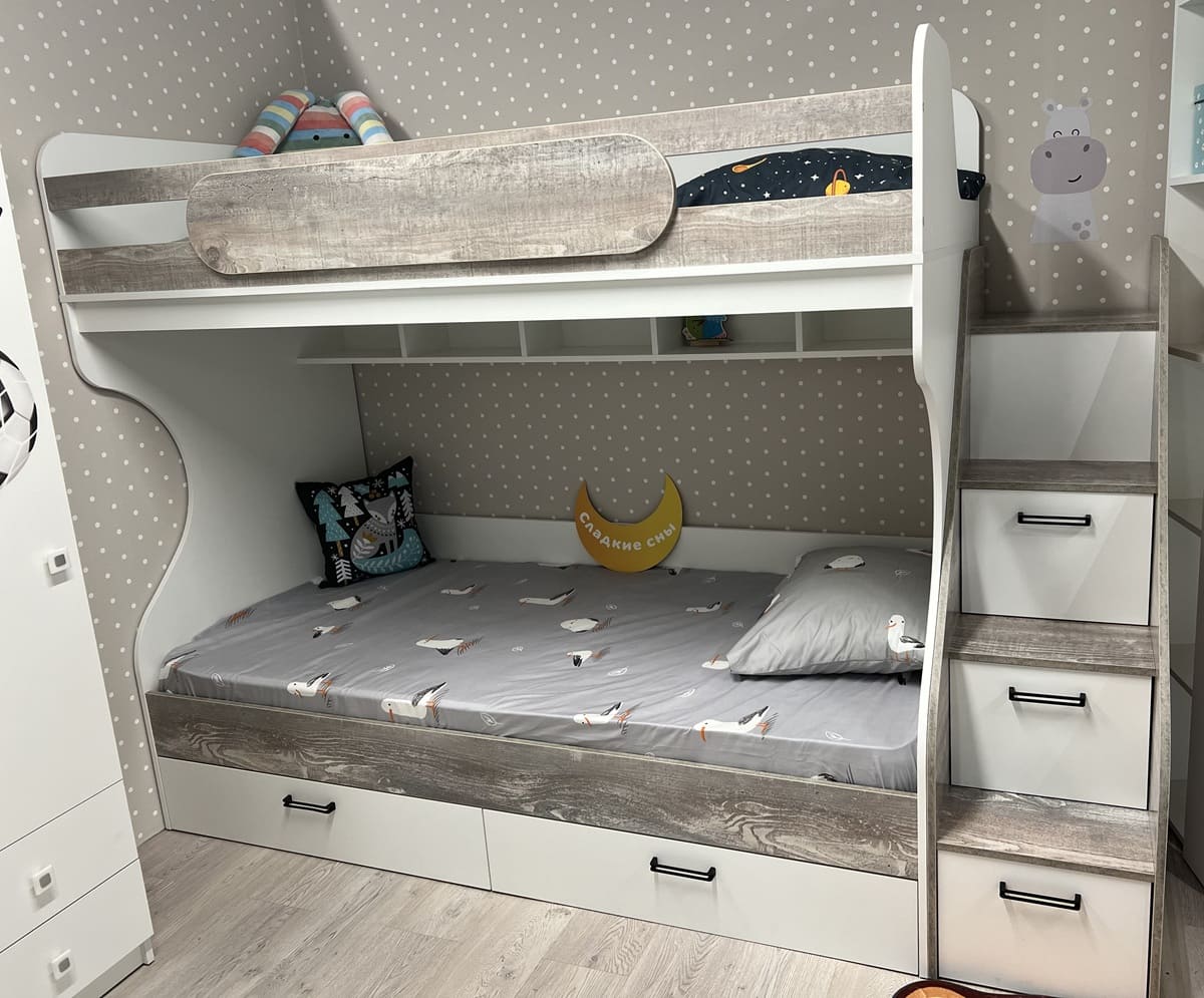 Высота кровати разработана с учетом того, чтобы на втором ярусе ребенку было не душно спать.