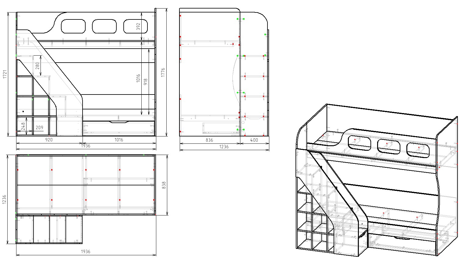 Габариты кровати: ширина 1936 х высота 1721 х глубина с учетом лестницы 1236 мм