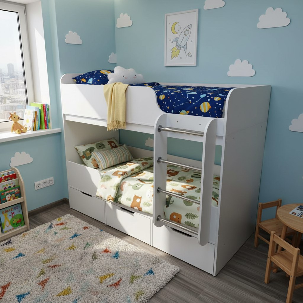Компактная двухъярусная кровать Малыши Двойняшки создана специально для небольших помещений.
