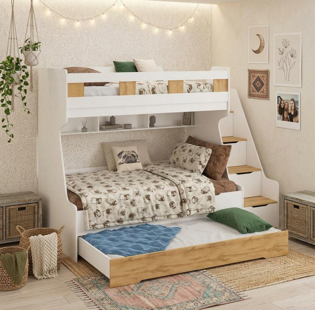 - Максимальная функциональность - два яруса обеспечивают удобство и экономию пространства, а дополнительное спальное место легко выдвигается, когда это необходимо.