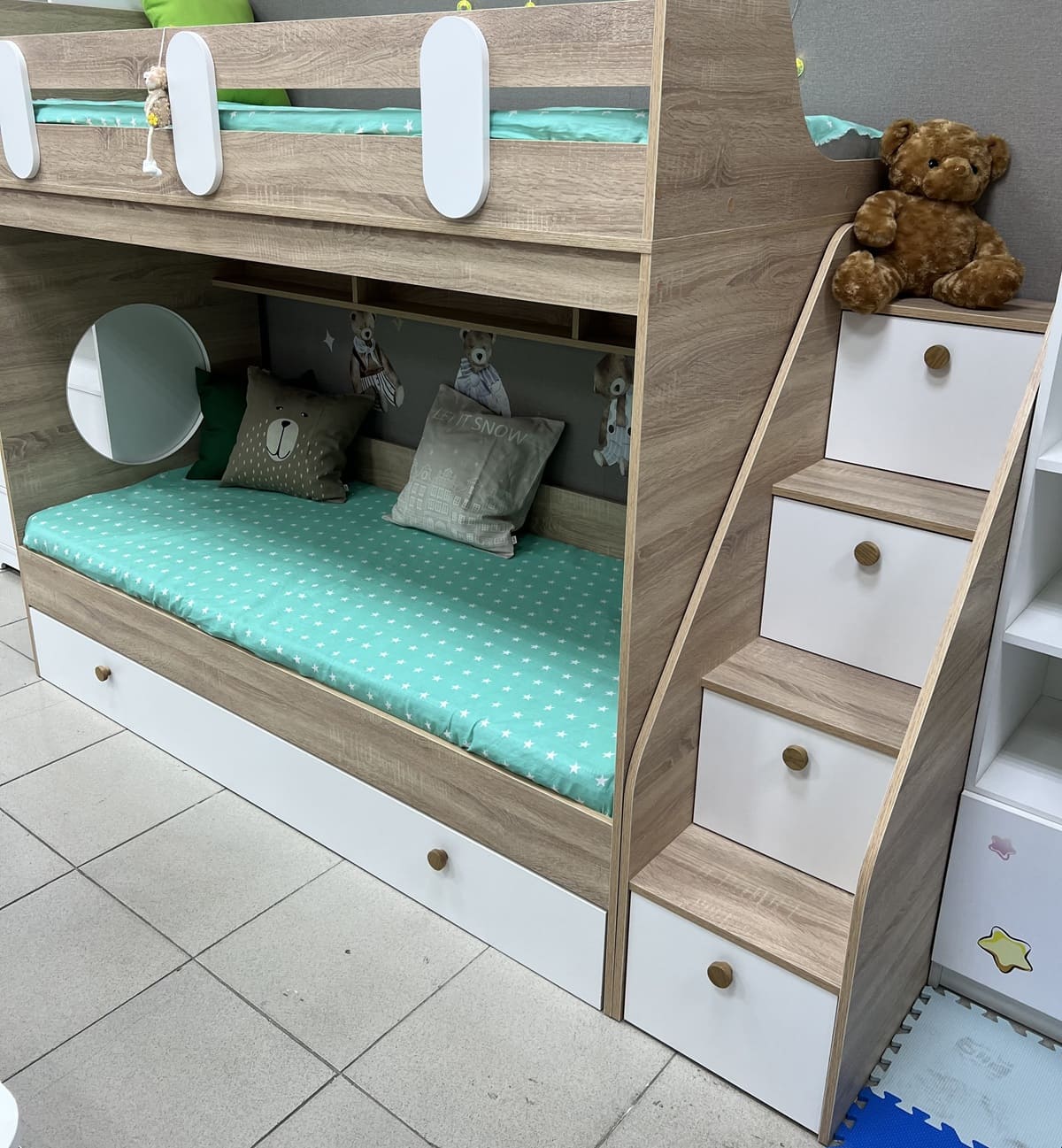 Основание кровати – настил ЛДСП, который позволяет ребенку спать на ровной поверхности, что важно для детской спины. Прочное основание не скрипит и не сломается при играх. Отлично подходит как для пружинных, так и беспружинных матрасов.