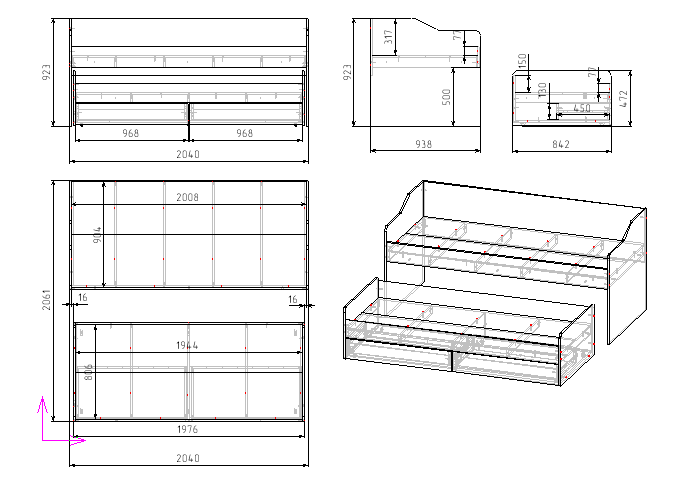 Выдвижное спальное место позволяет гибко использовать пространство, а два встроенных ящика в нижней кровати на шариковых направляющих обеспечат место для хранения.