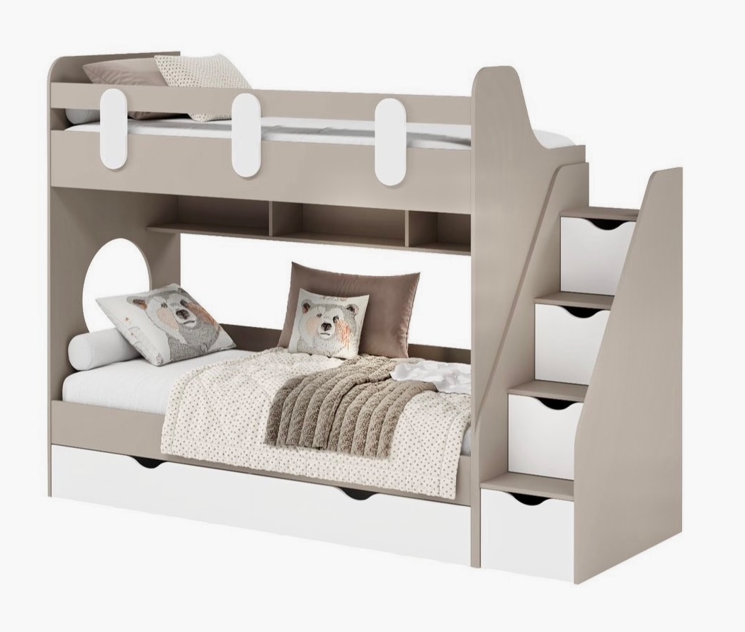 Выдвижные ящики в нижней кровати изготовлены с применением метабоксов, что делает изделие практичным и надежным.