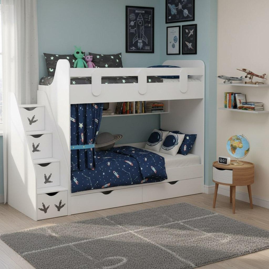 Выдвижные ящики в нижней кровати изготовлены с применением метабоксов, что делает изделие практичным и надежным.