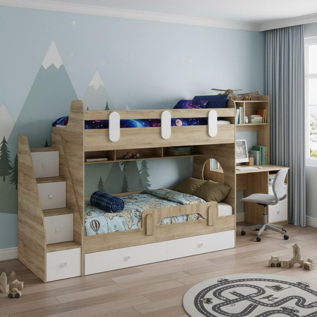 Два выдвижных ящика нижней кровати с прочным дном из ЛДСП 16 мм (не ДВП, не ХДФ!) выдерживают нагрузку до 45 кг каждый.