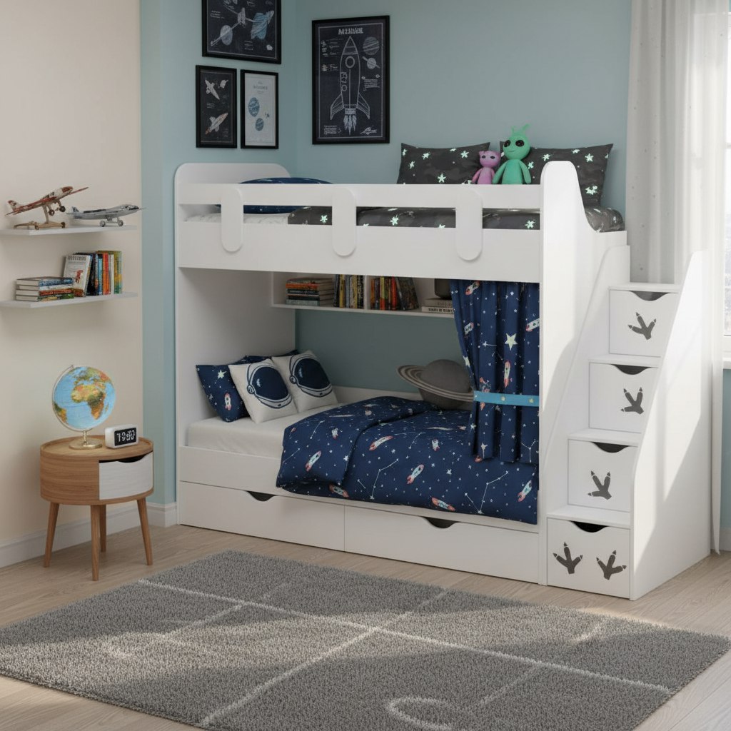 Выдвижные ящики в нижней кровати изготовлены с применением метабоксов, что делает изделие практичным и надежным.