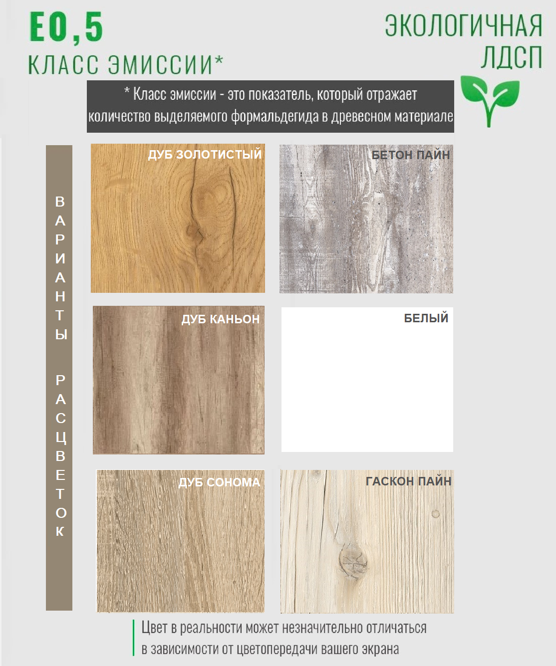 полностью белый, дуб каньон + белый, гаскон пайн + белый, дуб золотистый + белый, дуб сонома + белый.