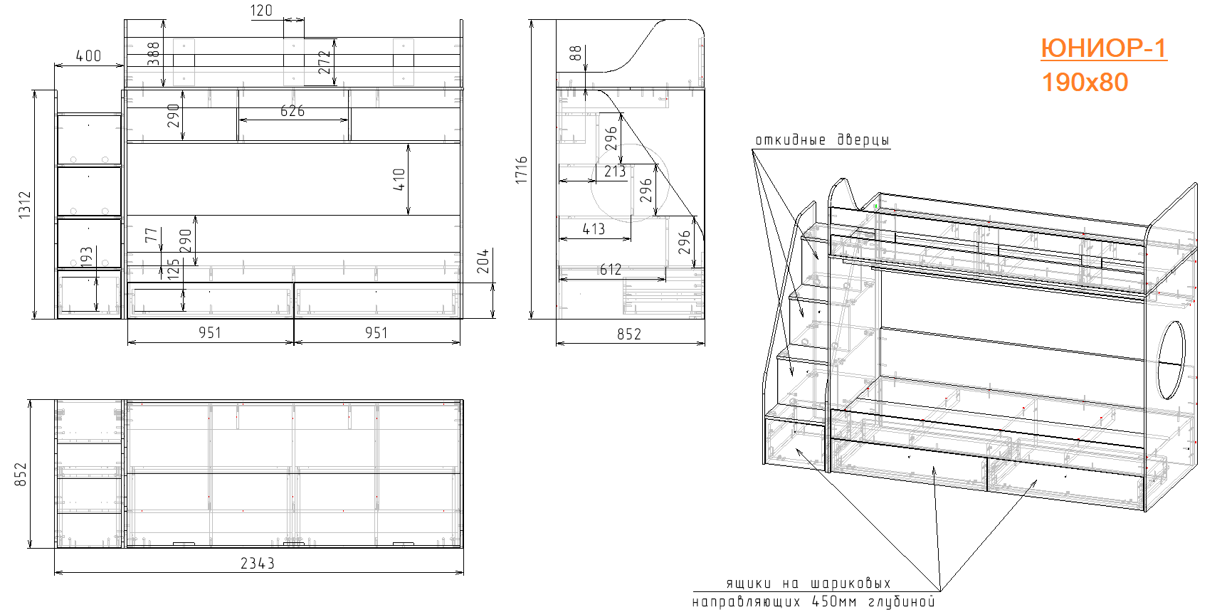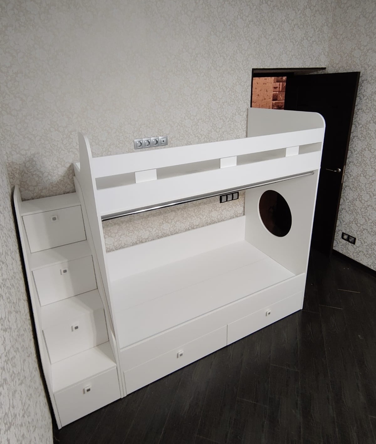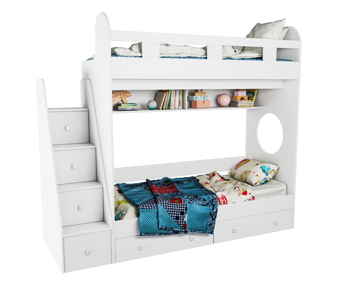 спальное место для двоих, навесная полка для книг и игрушек, вместительные выдвижные ящики под кроватью, а также безопасная лестница, обеспечивающая быстрый и удобный доступ на второй этаж.