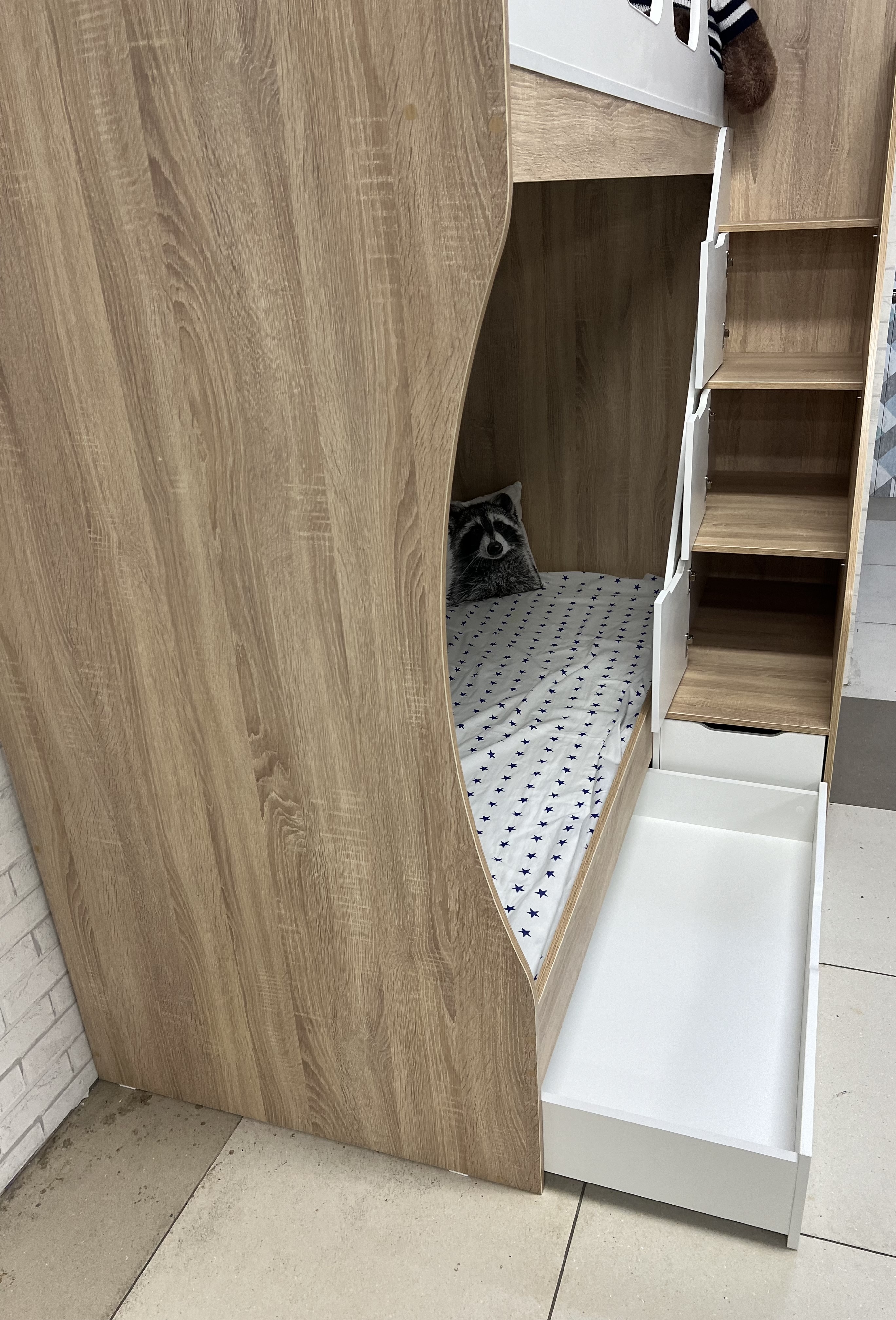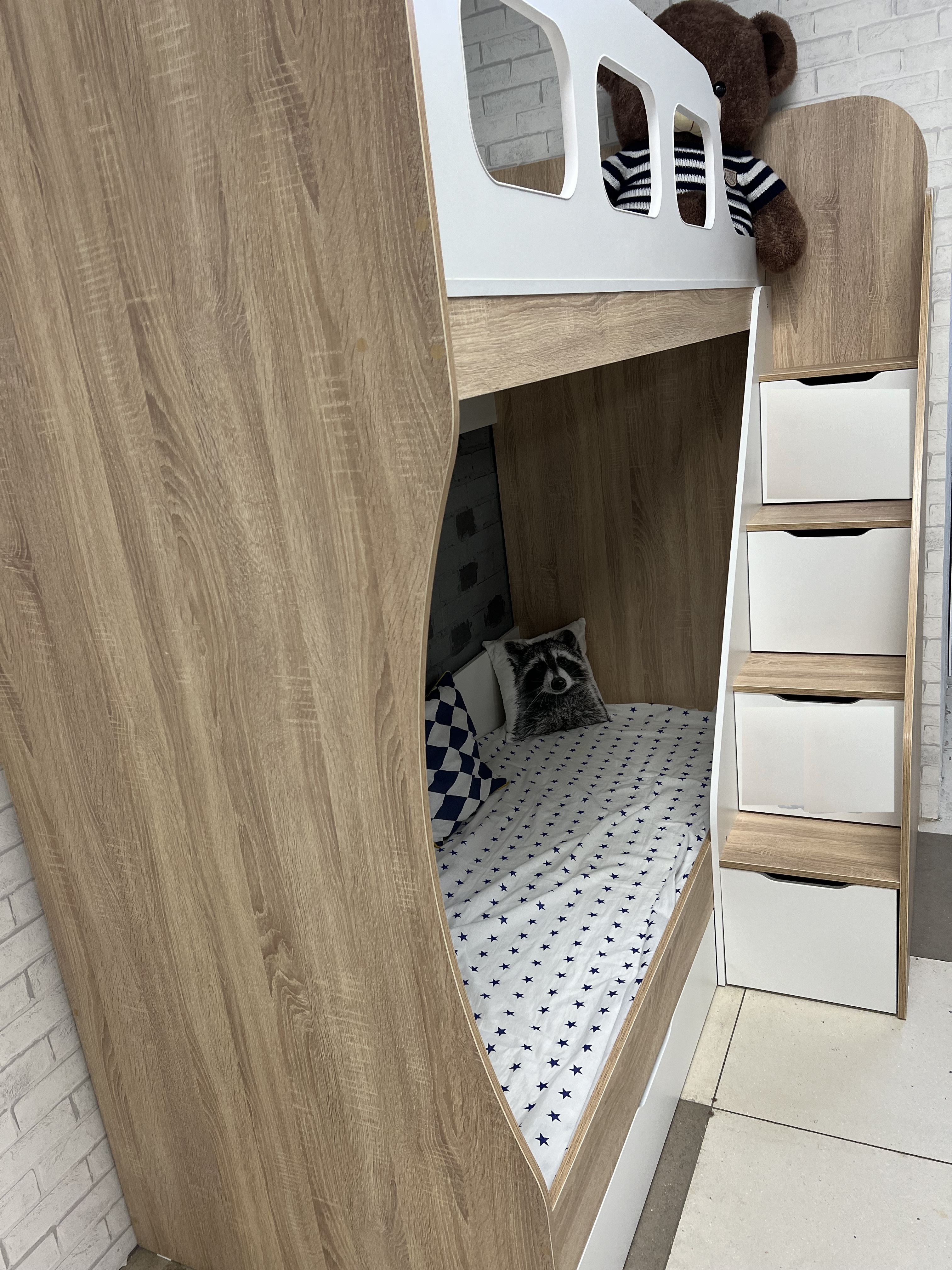* В нижнюю кровать встроен выдвижной ящик для белья и игрушек.