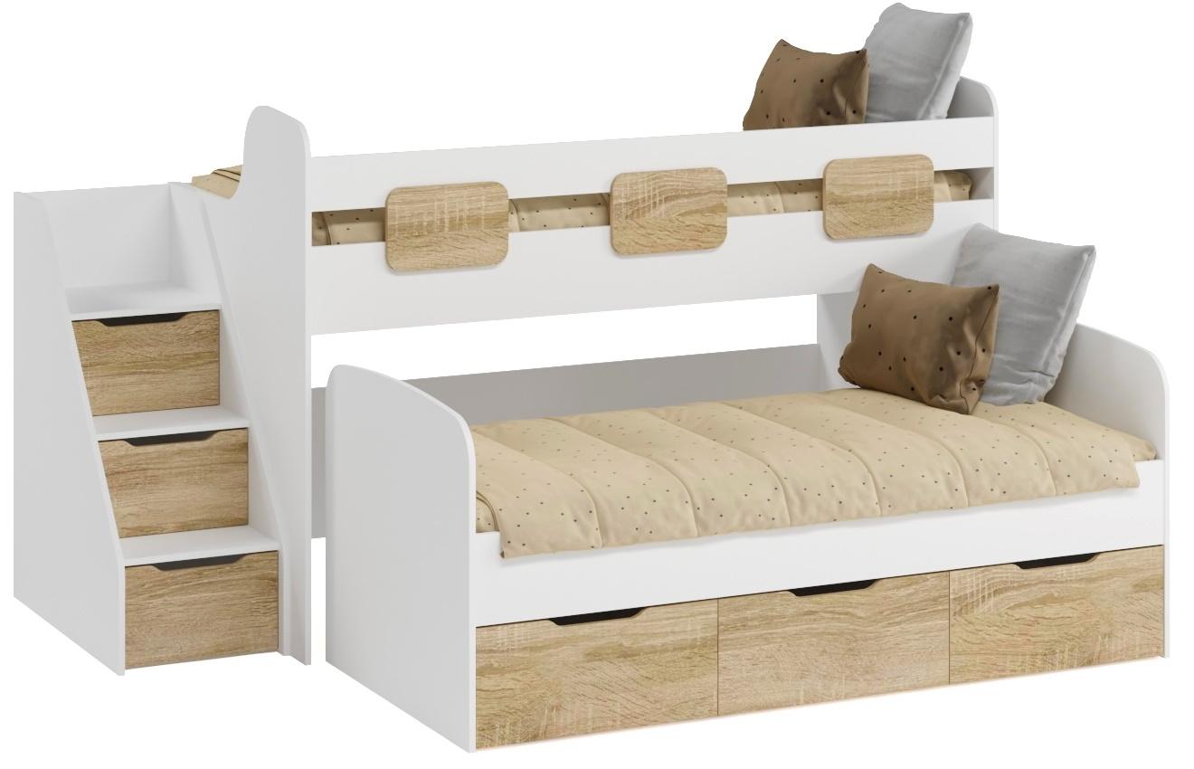 Белый цвет мебели в сочетании с природными оттенками цвета "дуб сонома" отлично подходит разнополым детям.