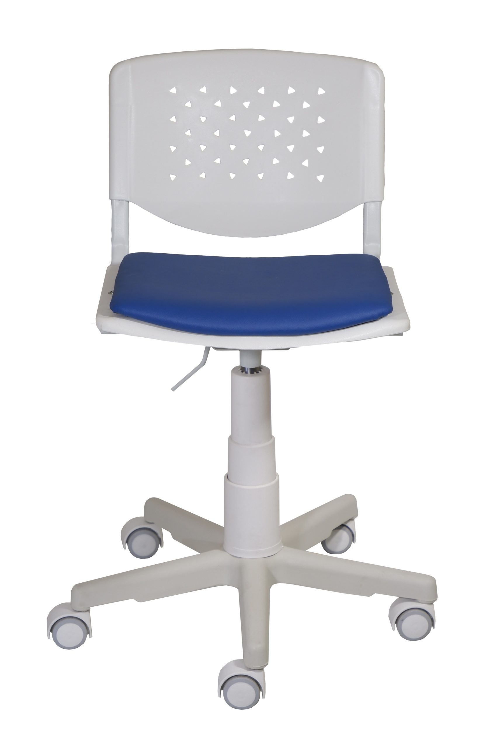 Кресло на белом каркасе в белом пластике с мягкой накладкой на сидении из заменителя кожи.
