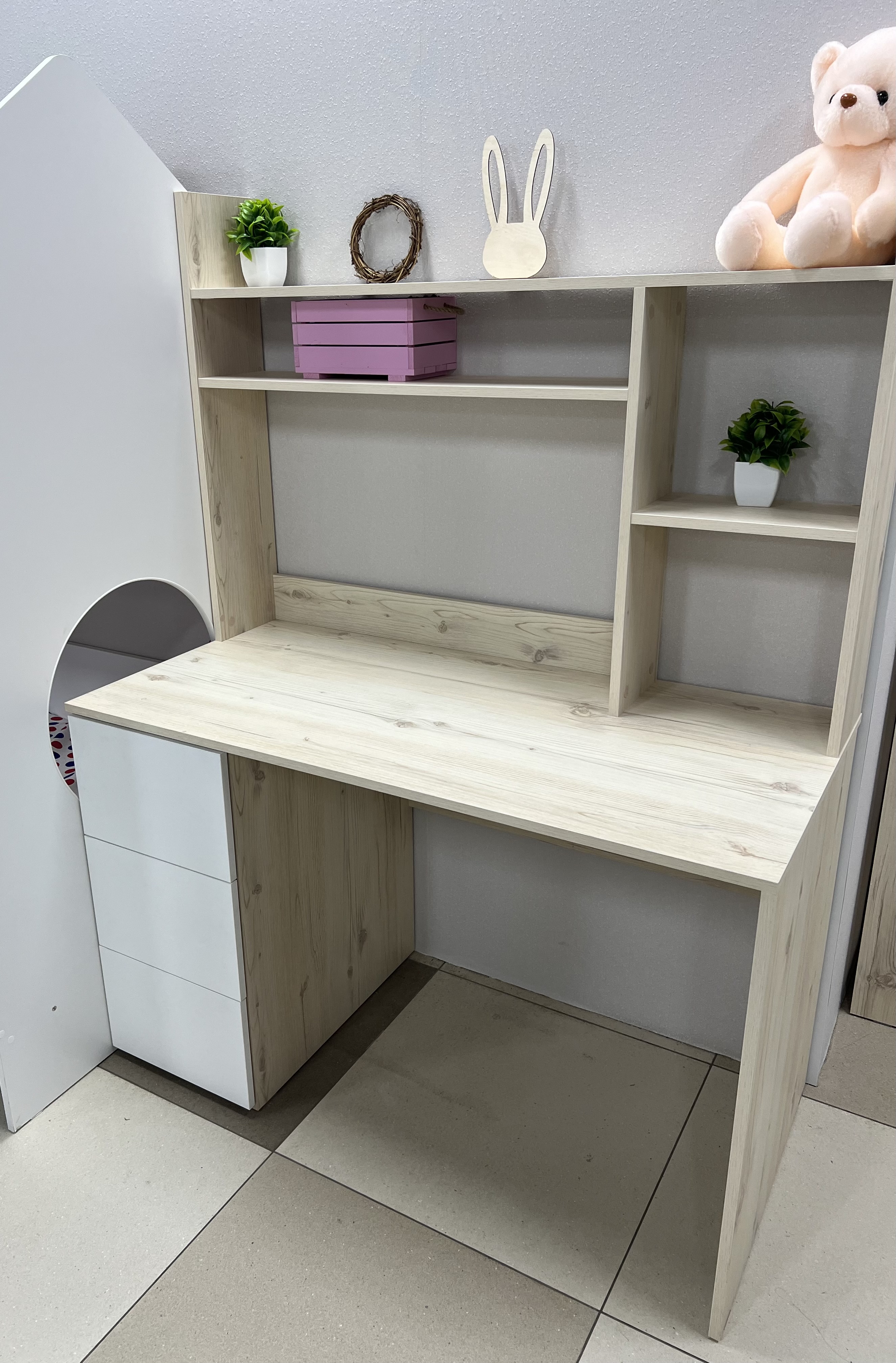 Практичный и удобный стол займет немного места в комнате и в тоже время позволит разместить учебники, любимые книги и игрушки.