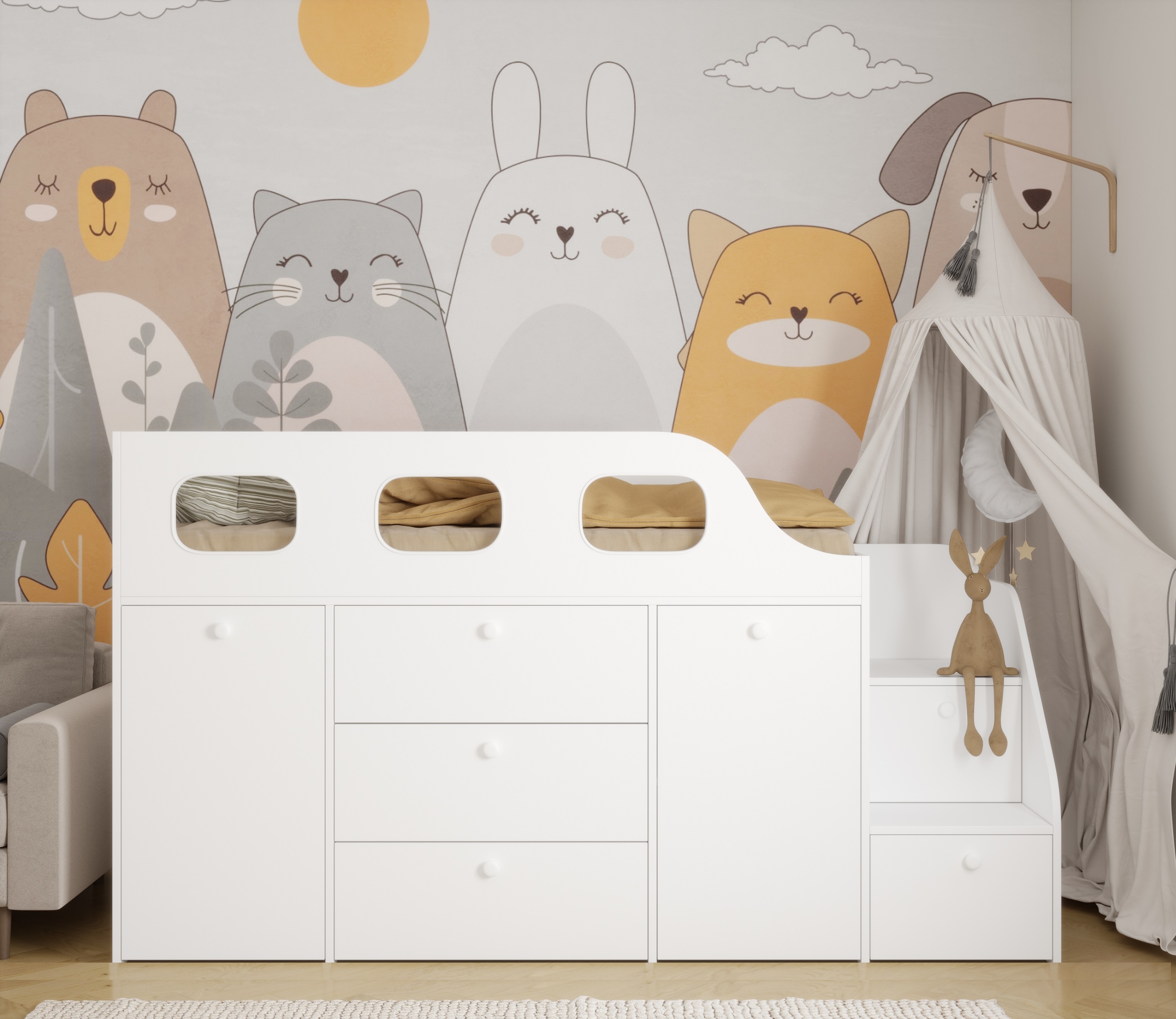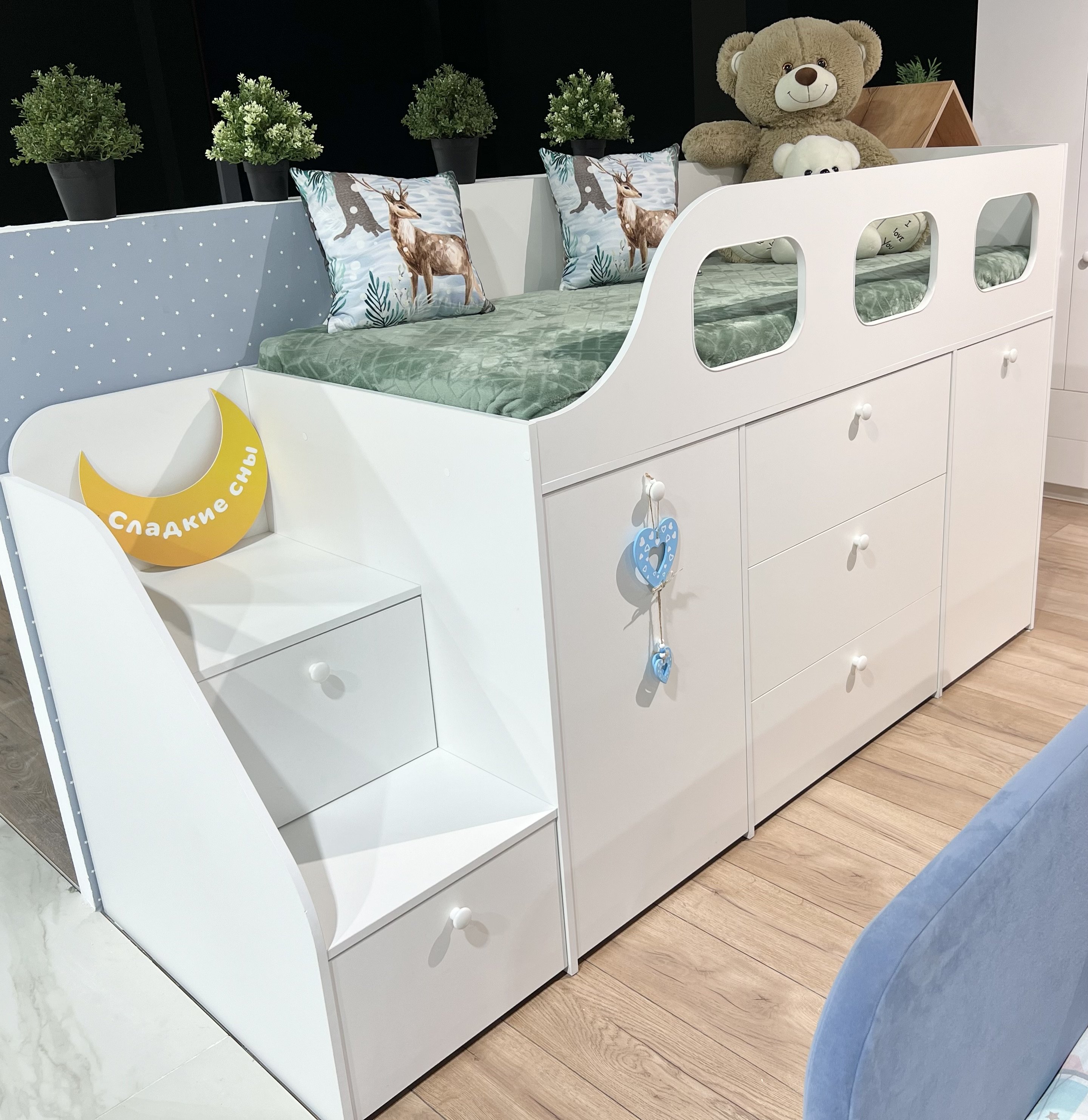 Основание кровати – прочный настил ЛДСП, который позволяет ребенку спать на ровной поверхности, что важно для детской спины.
