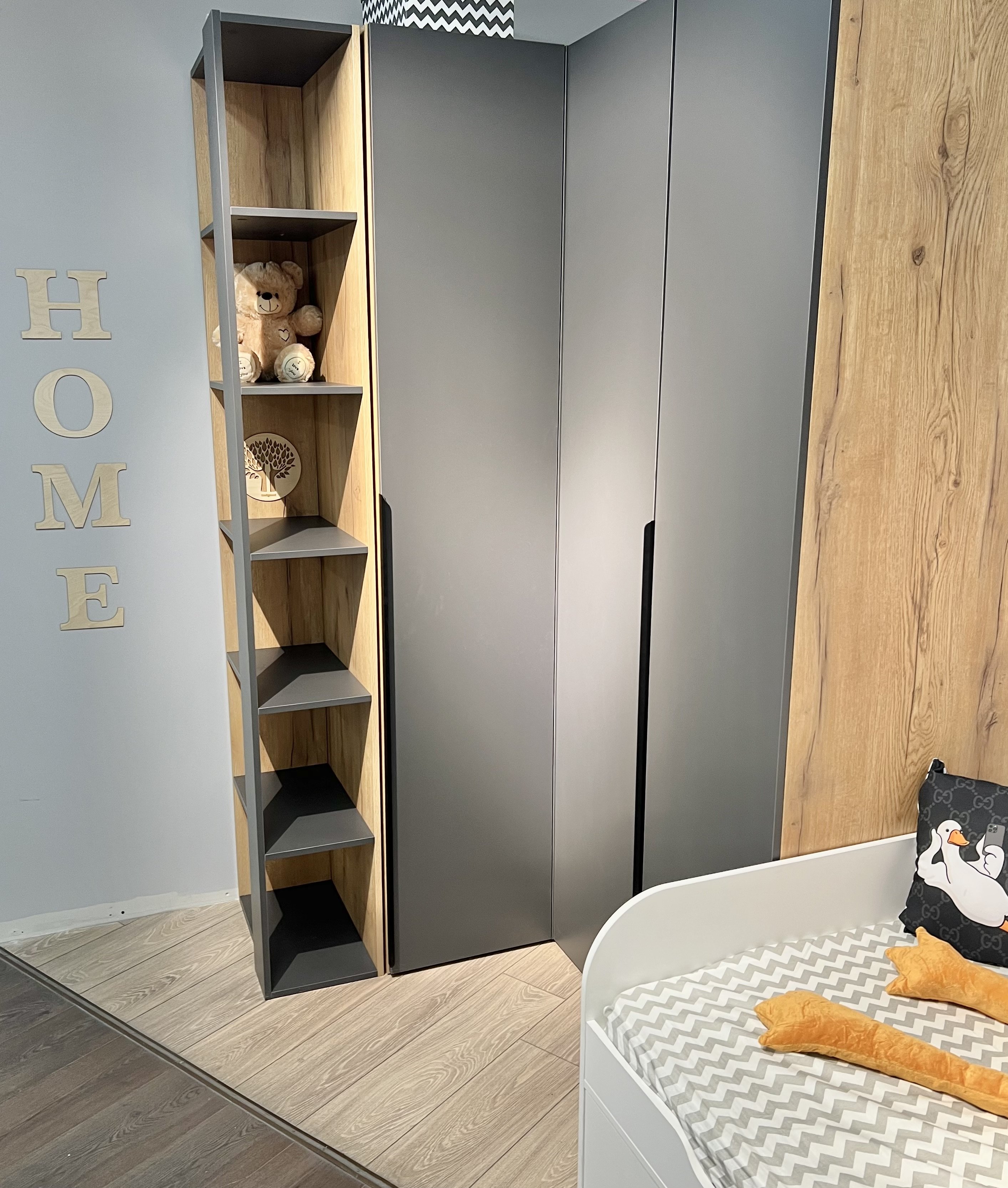 корпус белый + фасады графит, корпус белый + фасады дуб золотистый, корпус графит + фасады белые, корпус дуб золотистый + фасады графит, полностью белый или полностью велюр