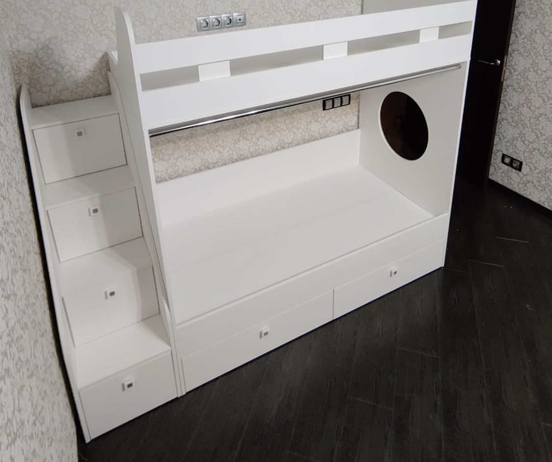 В лестницу встроены ящики для игрушек (нижний ящик на шариковых направляющих, остальные ящики имеют откидные фасады).
