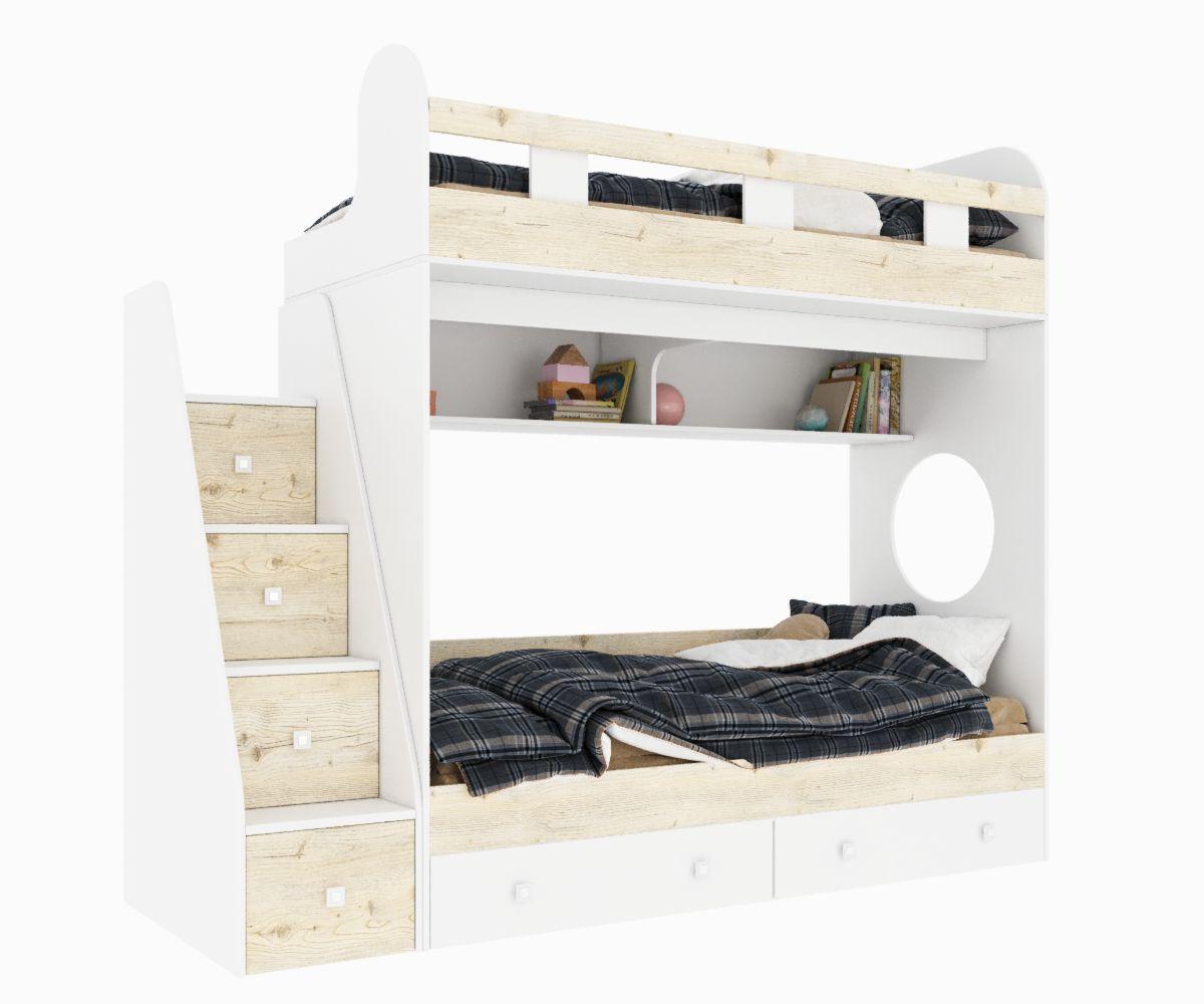 спальное место для двоих, навесная полка для книг и игрушек, вместительные выдвижные ящики под кроватью, а также безопасная лестница, обеспечивающая быстрый и удобный доступ на второй этаж.
