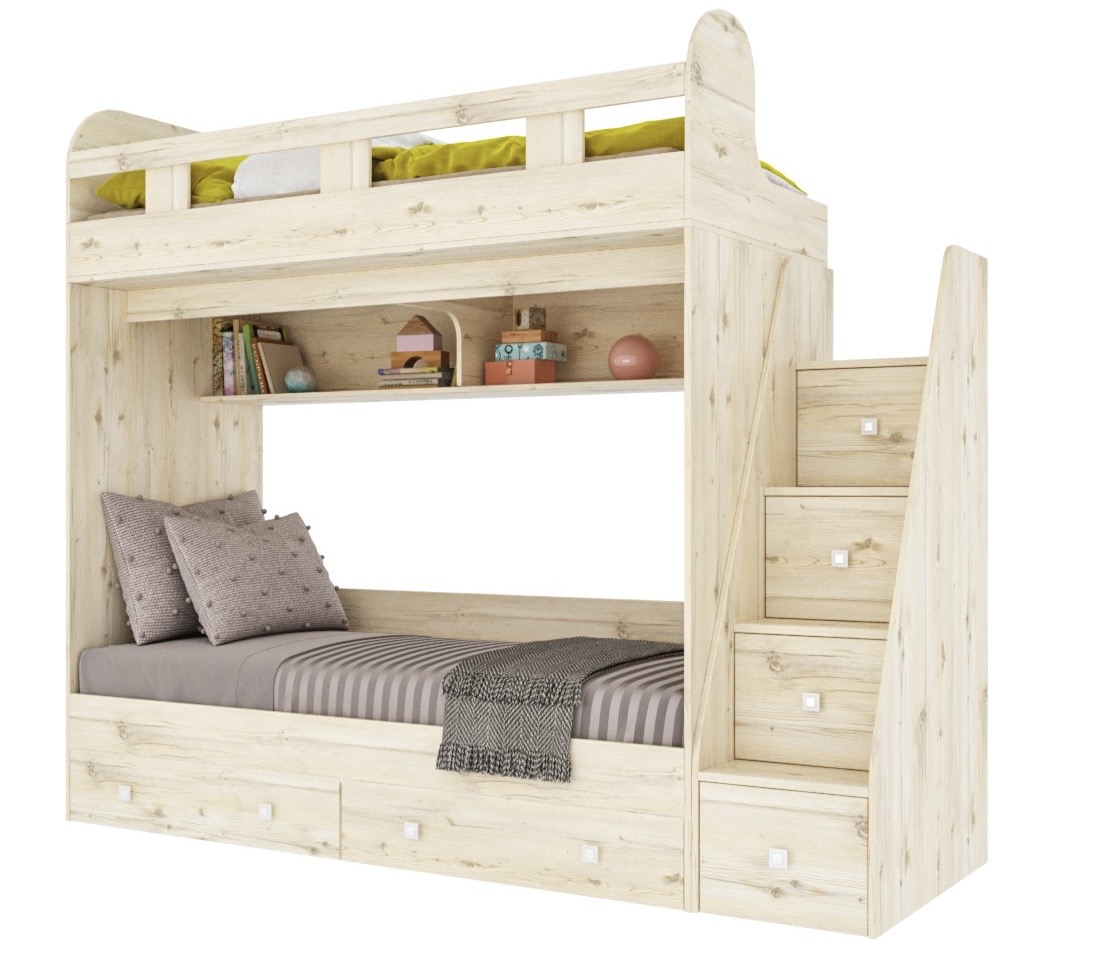 спальное место для двоих, навесная полка для книг и игрушек, вместительные выдвижные ящики под кроватью, а также безопасная лестница, обеспечивающая быстрый и удобный доступ на второй этаж.