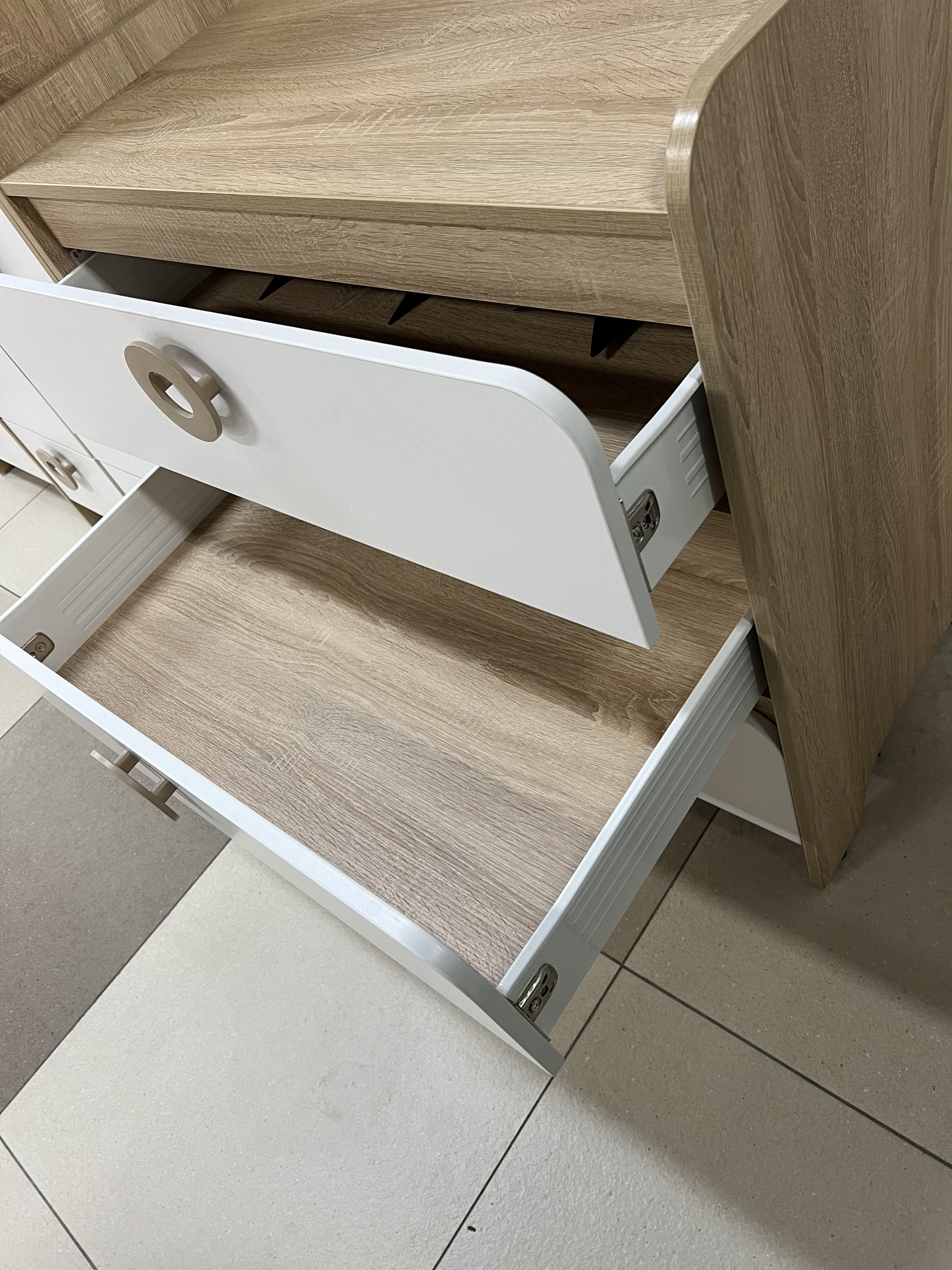 Выдвижные ящики выполнены с применением метабоксов, что делает изделие надежным и практичным.