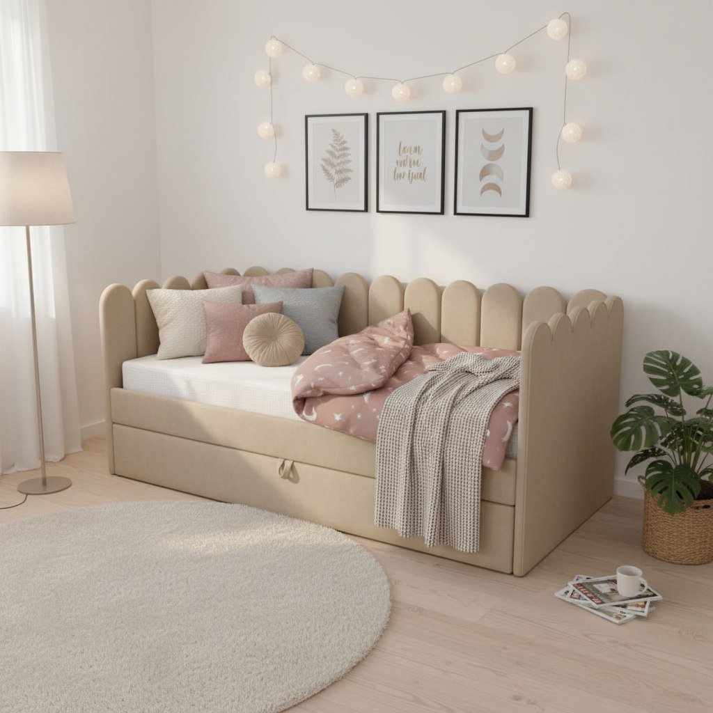 В комплект кровати входит выкатной ящик, который можно использовать как дополнительное спальное место или как ящик для хранения белья и игрушек.