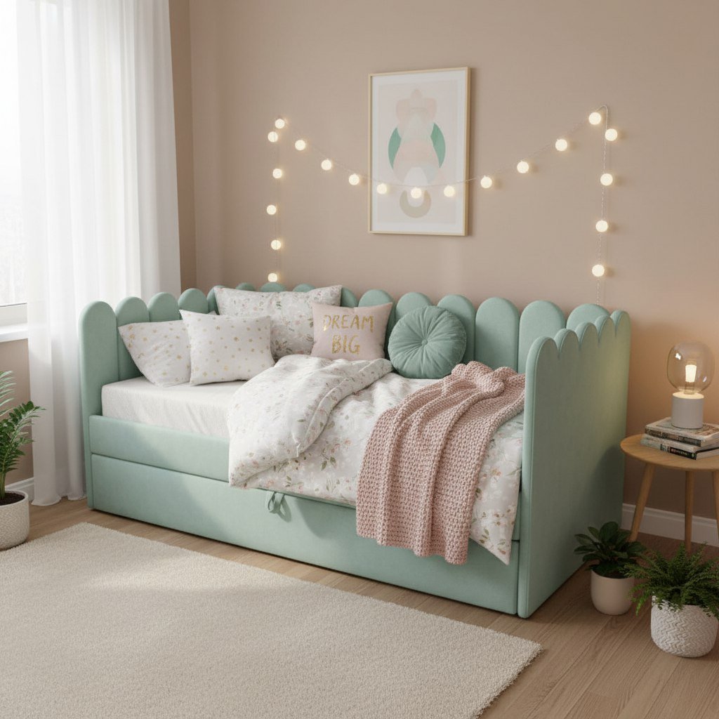 Кровать полностью безопасна для ребенка, так как имеет прочную конструкцию и мягкие подлокотники, которые защитят ребенка от травм.