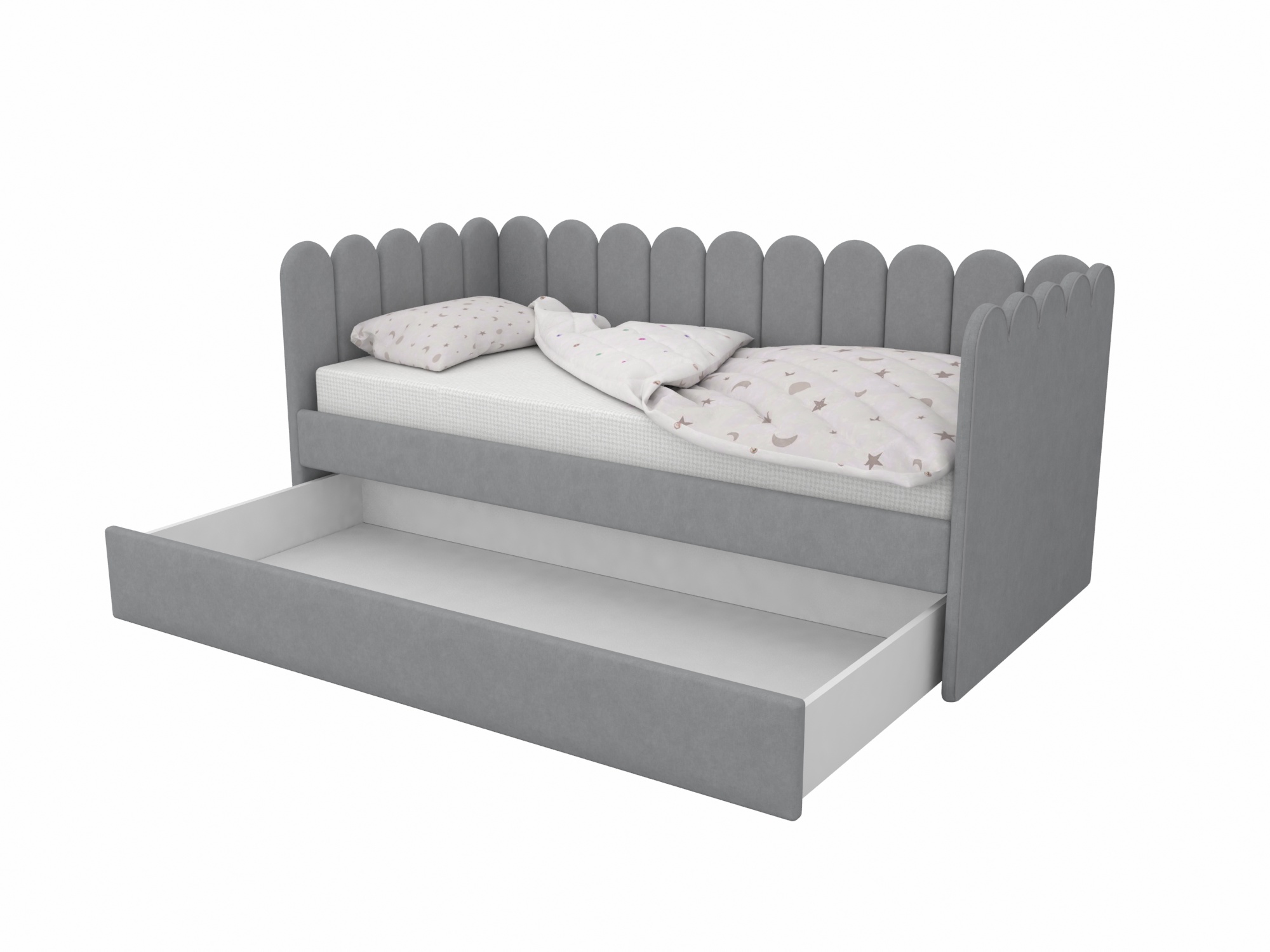 В комплект кровати входит выкатной ящик, который можно использовать как дополнительное спальное место или как ящик для хранения белья и игрушек.