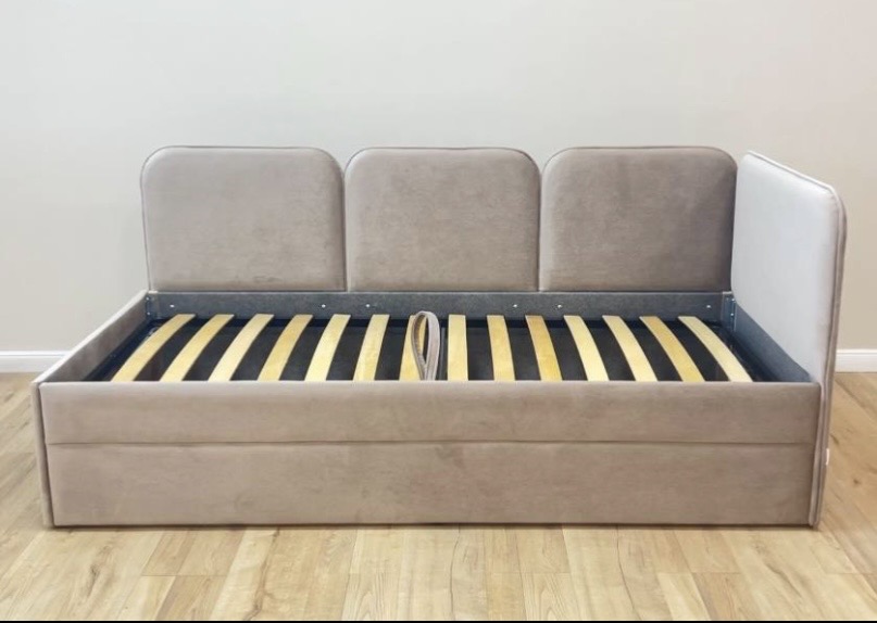 Мягкие панели, ящик для хранения, ортопедическое основание и возможность установить бортик для защиты от падения во время сна.