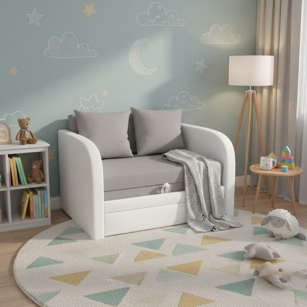 Диван полностью безопасен для ребенка, так как имеет прочную конструкцию и мягкие овальные подлокотники, которые защитят ребенка от травм.