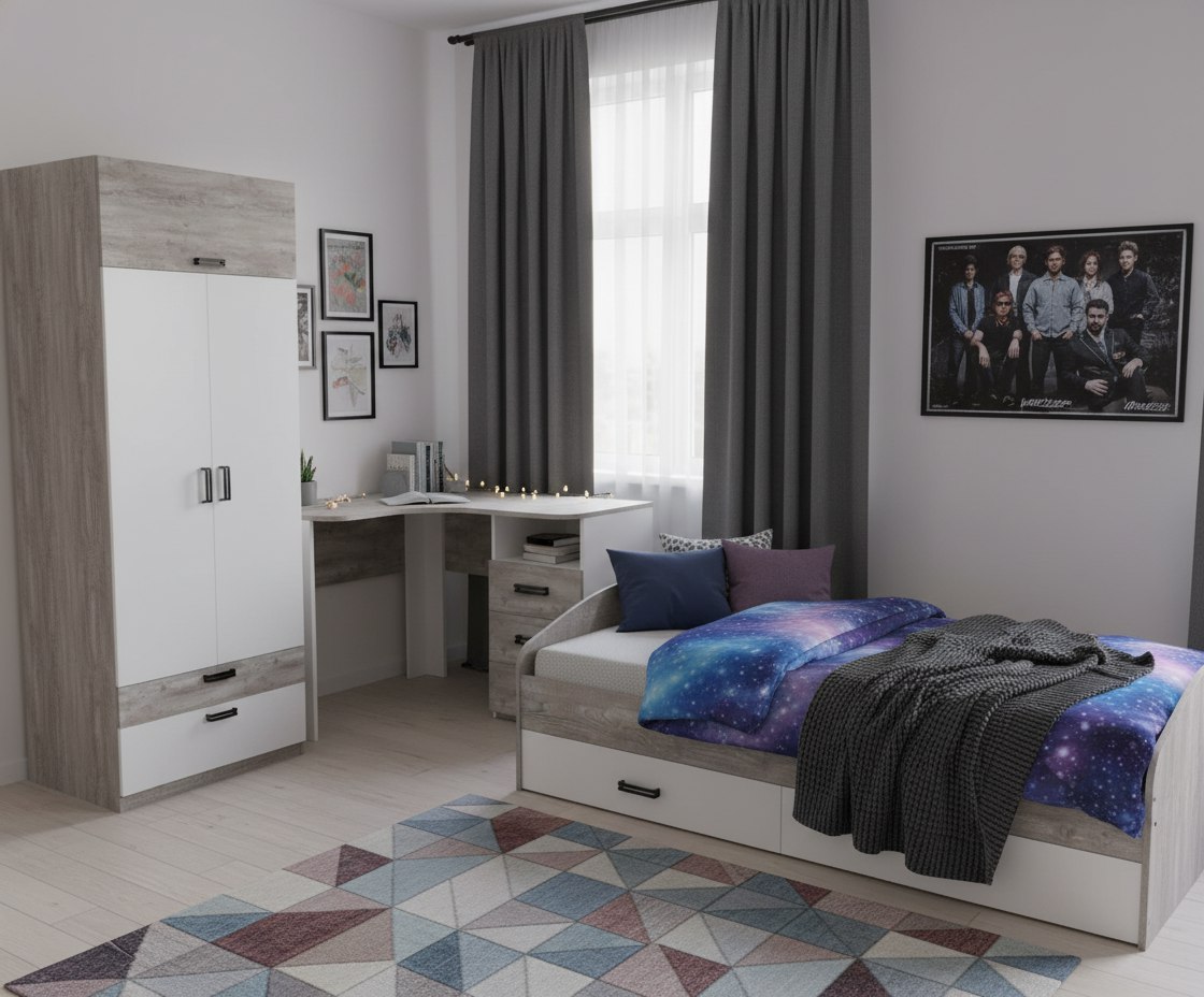 Мебель выполнена из сертифицированного, качественного, экологически чистого ЛДСП класса Е0,5 в сочетании модного цвета "бетон пайн" с белым.