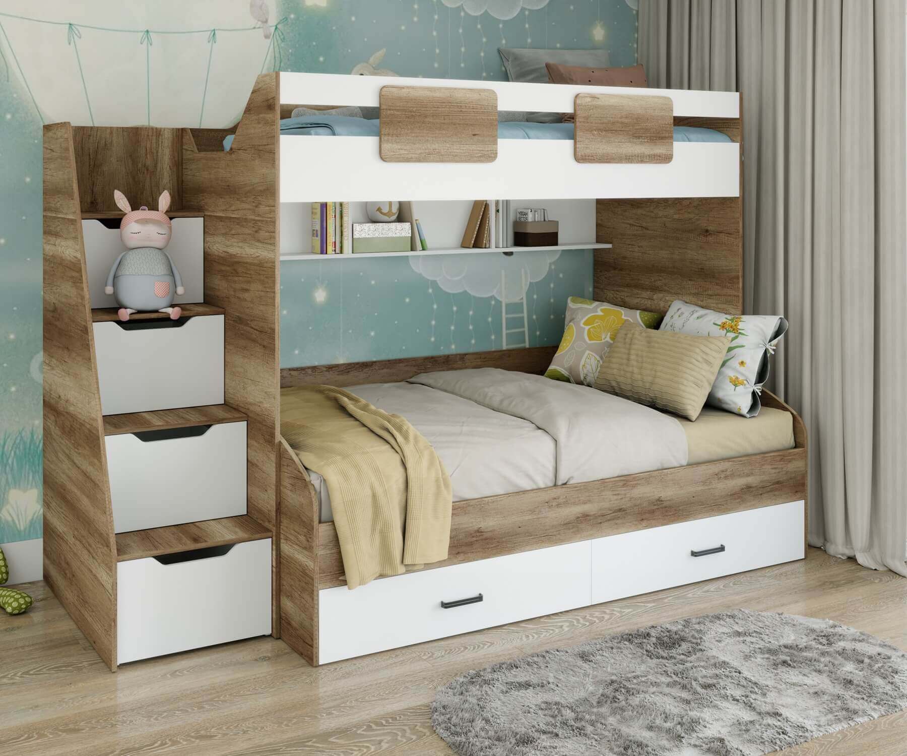 В лестницу встроены выдвижные ящики для игрушек - удобно и практично.