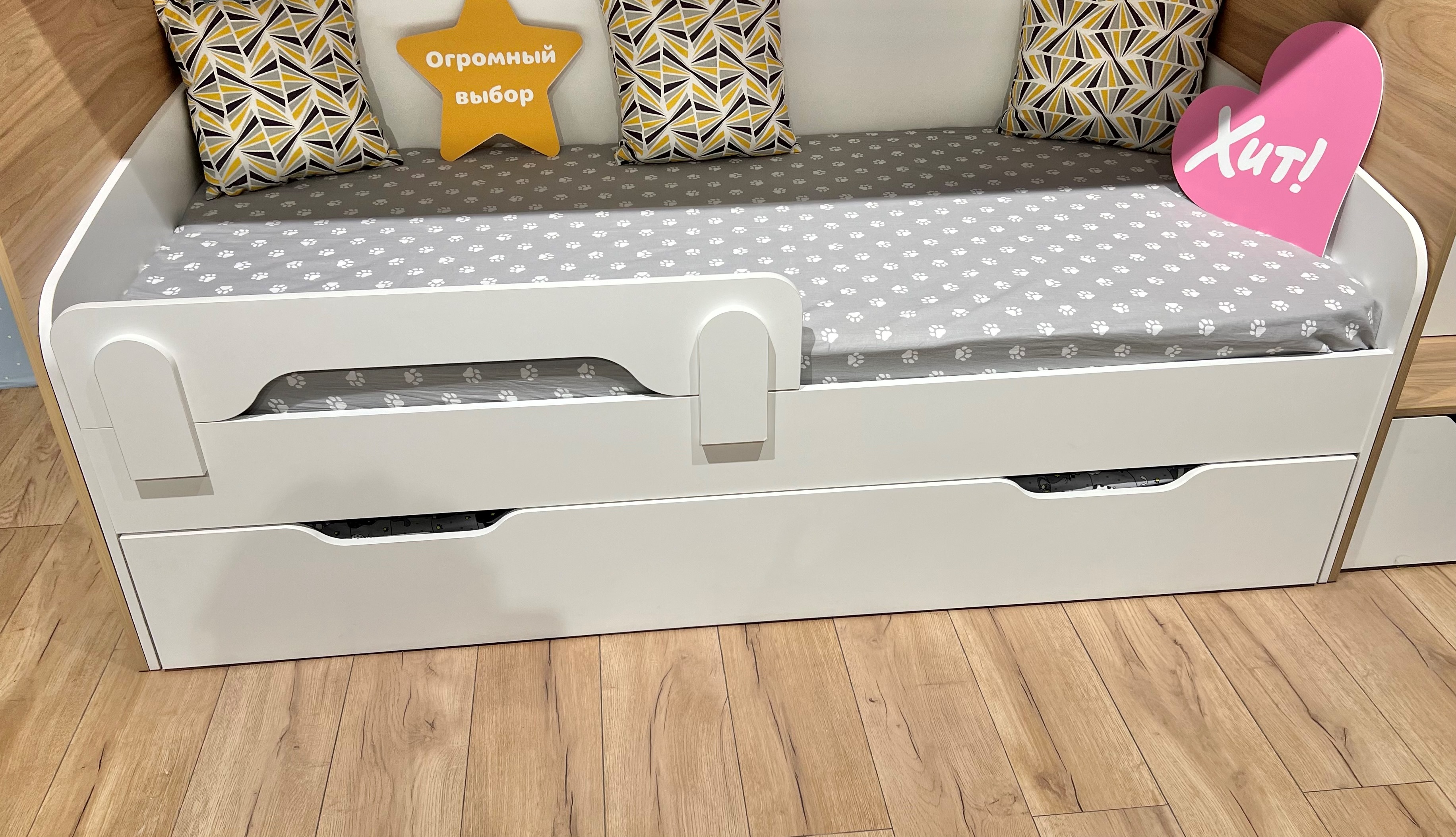 Экономия пространства: выдвижное спальное место легко убирается под основную кровать, освобождая место для игр и активного отдыха.