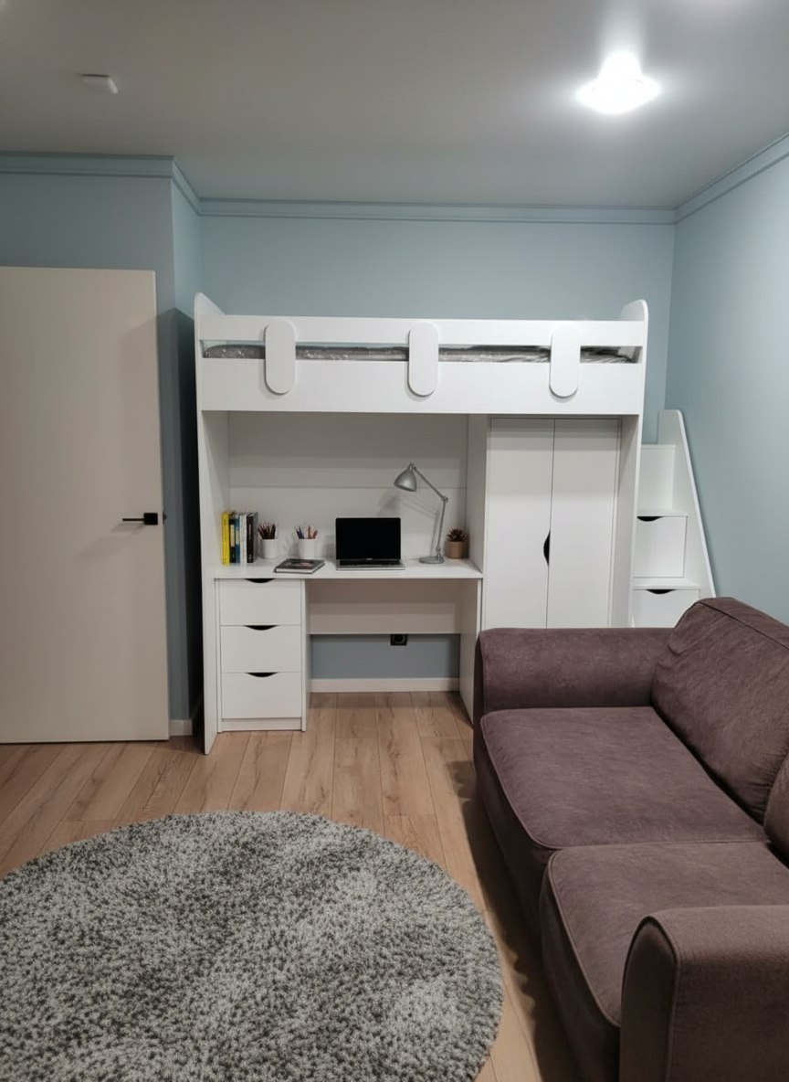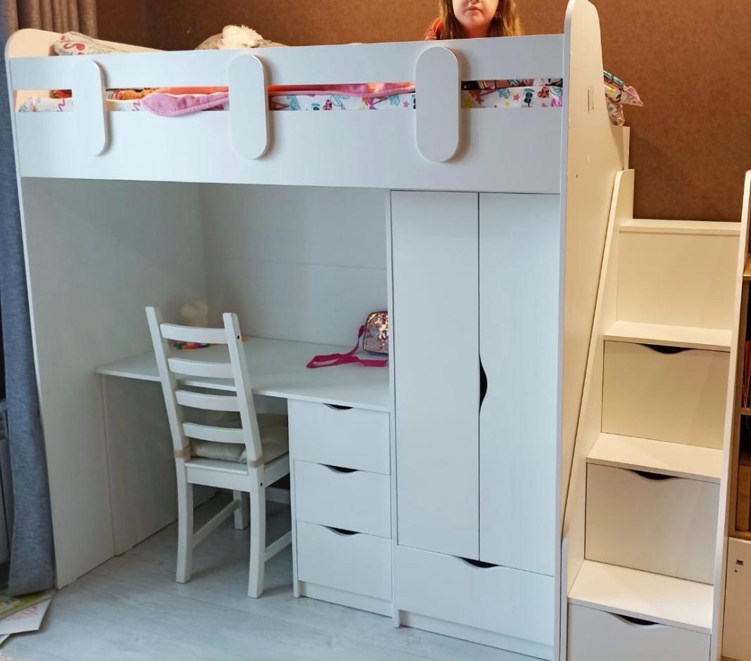 <comment>Так как в комнате мало места, пришлось совместить два чердака и оставить одну лестницу. Очень удобно, что сразу получился полноценный набор для каждого ребенка. Кровать, стол, шкафчик. Очень функционально. Дети довольны! Спасибо </comment>