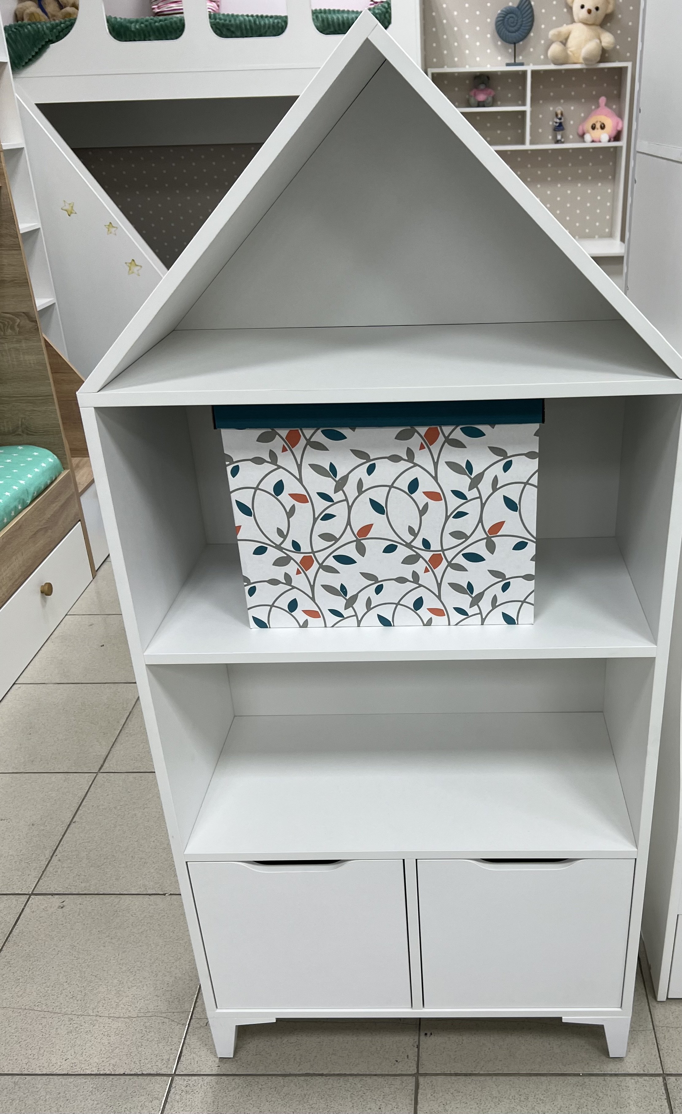 Стеллаж в виде домика - оригинальное и практичное дополнение в интерьере детской комнаты.