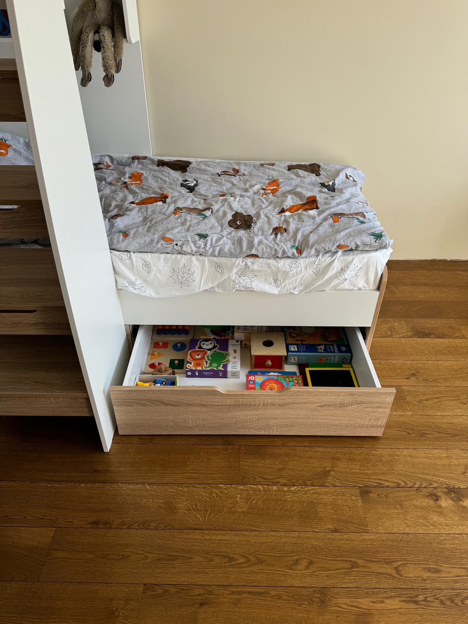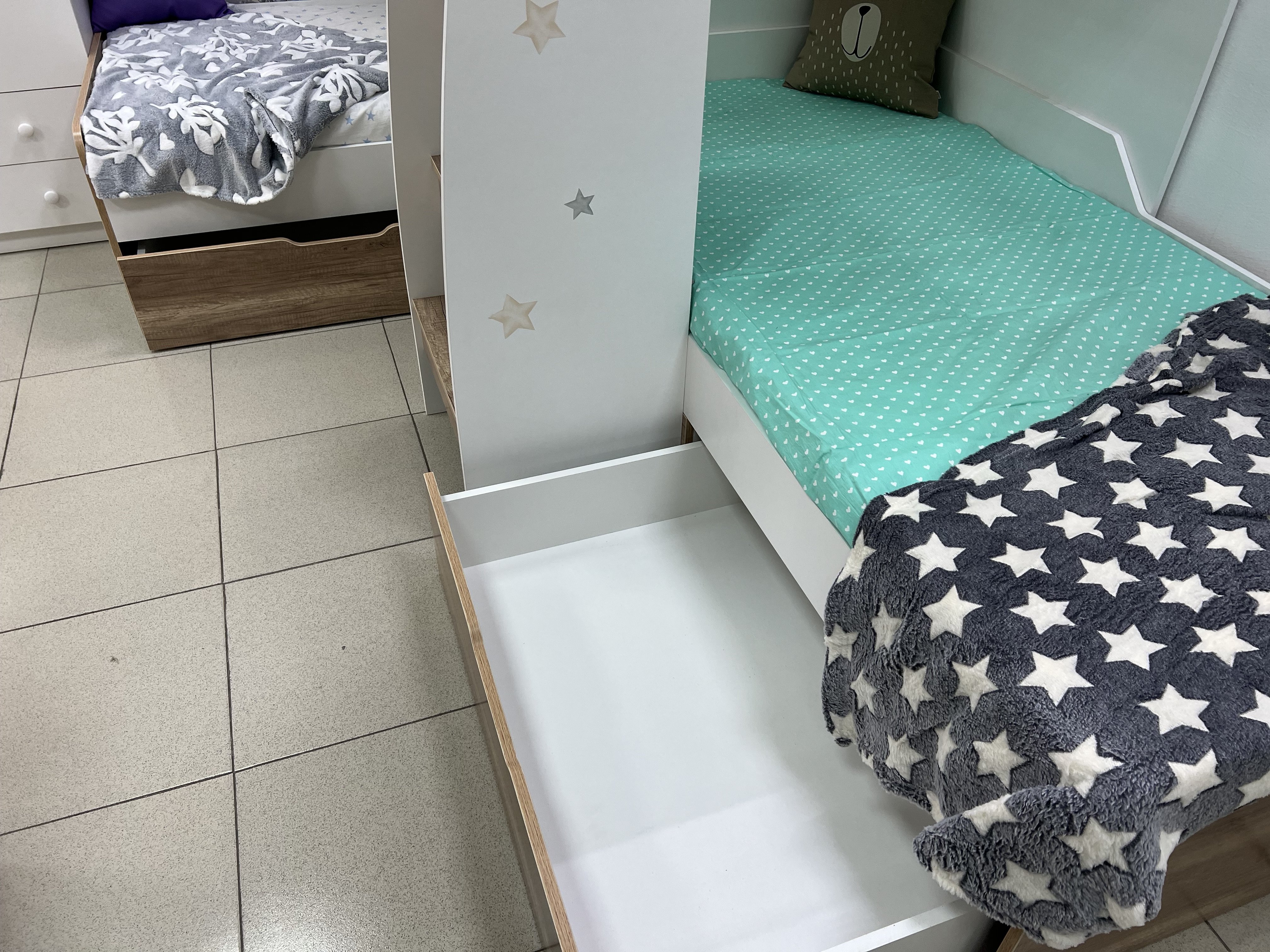 Вместо них - цельный и прочный настил из ЛДСП, который выдерживает сверхвысокую нагрузку и позволяет расположиться даже взрослому с ребенком.